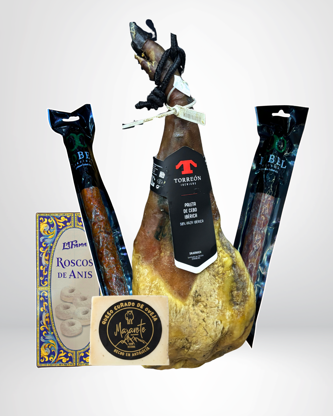 Paleta de cebo ibérica de 5kg aprox., Salchichón de bellota, Chorizo de bellota, Queso curado de oveja y Roscos de anís.
